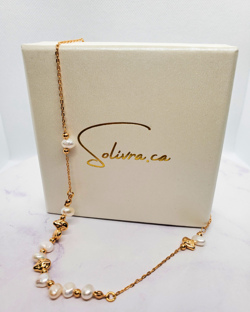 D) Elaria Pearl Necklace - 18K Gold Vermeil finish on 925 sterling silver base, Freshwater pearls, Total Length: 200mm (adjustable length 160-200mm), Weight: approx. 8g
