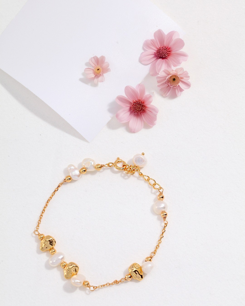 E) Elaria Pearl Bracelet - 18K Gold Vermeil finish on 925 sterling silver base, Freshwater pearls, Total Length: 200mm (adjustable length 160-200mm), Weight: approx. 5g
